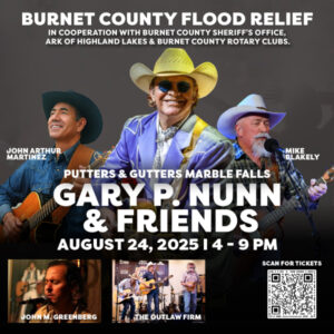 Join us for an unforgettable evening at the Burnet County Flood Relief Concert featuring Texas country legend Gary P. Nunn and an incredible lineup of local artists! On August 25th, 2025, from 4 to 9 PM at Putters & Gutters in Marble Falls, come together for a night filled with music, community spirit, and hope. Your support will directly benefit families affected by the devastating floods of 2025. Don’t miss this chance to make a difference—every ticket and donation counts! Help us spread the word and be part of the recovery journey!