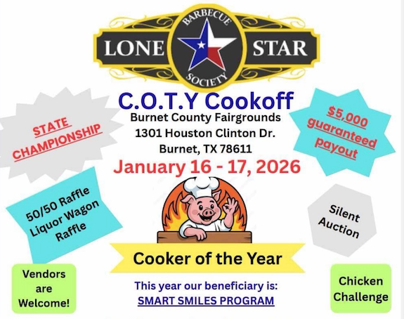Fri 16 Lone Star BBQ Society C.O.T.Y Cookoff – Dental Clinic Fundraiser Burnet County Fairgrounds 1301 Houston Clinton Dr., Burnet, TX January 16, 2026 - January 17, 2026